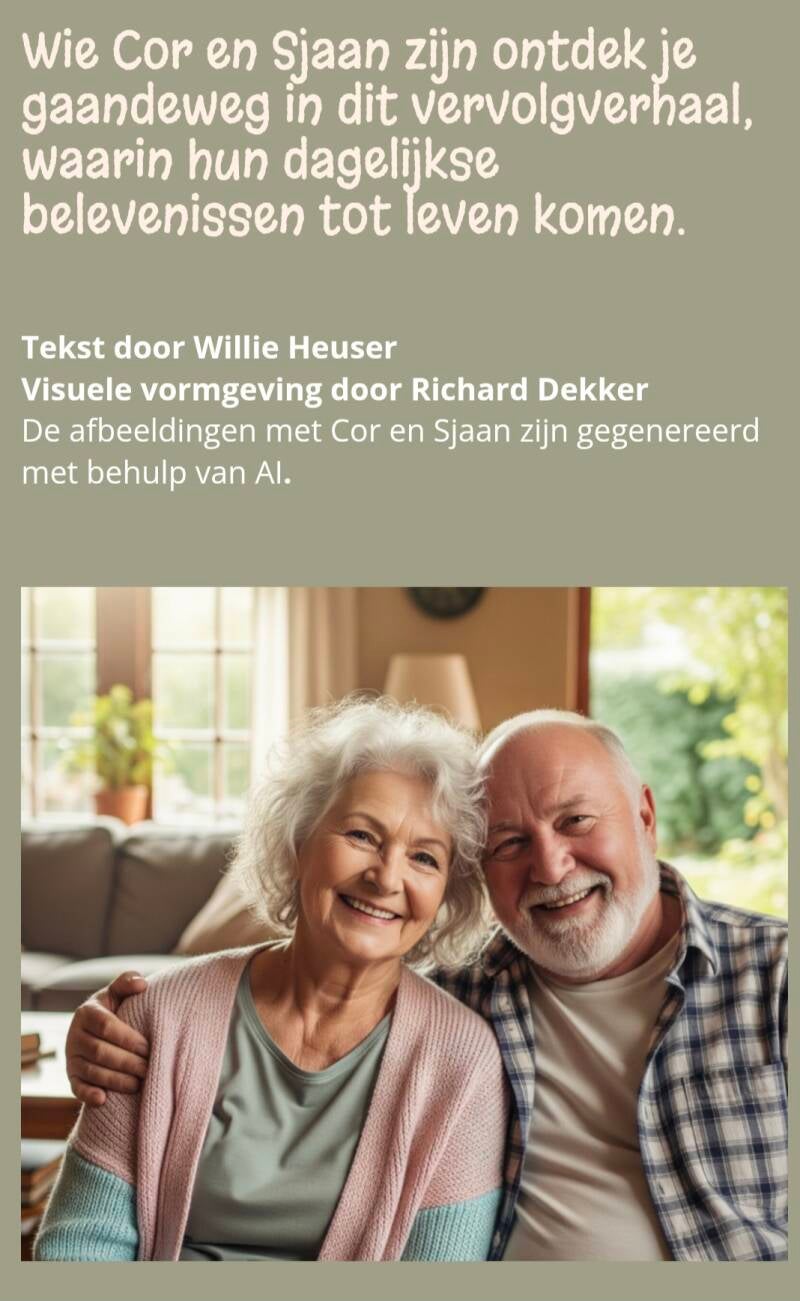 Even voorstellen: Cor (78 jaar) en Sjaan (74 jaar) zijn 54 jaar getrouwd, hebben twee kinderen, vijf kleinkinderen, een achterkleinkind en wonen op Dubbeldam. Je zult Cor en Sjaan gaandeweg leren kennen, dus ik ga hier geen karaktertrekken verklappen.