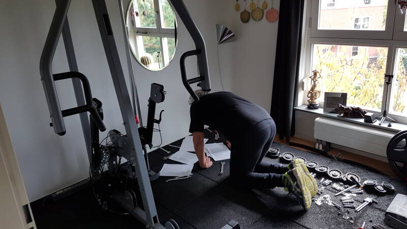 Na de lock-down zijn we nog twee keer in de gym gaan trainen, voornamelijk voor de apparaten die ik thuis miste. Maar de behoefte om weer vier keer in de week in een sportschool aanwezig te zijn was verdwenen. Thuis trainen voldeed prima, wel jammer van de apparaten waarbij je echt zwaarder mee kon trainen. Ik deed alles lekker met banden en dumbells totdat..... mijn man enthousiast vertelde dat hij een geweldig trainingsapparaat had gevonden. Met legpress en al! Het moest wel zelf gedemonteerd worden. Dat betekende dus ook, weer zelf in elkaar zetten.