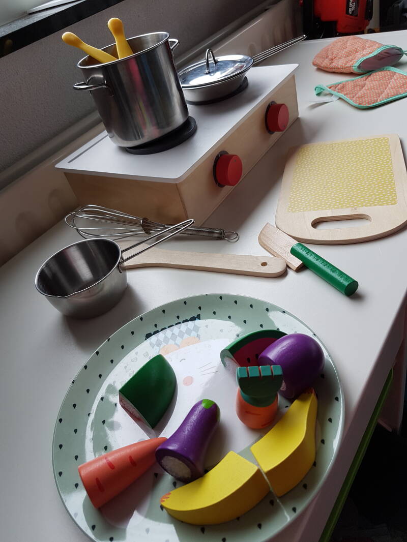 Spelen met Max is ook heel gezellig, maar dat moet dan wel met overgave gebeuren, volgens hem. Dus trekt hij je er telkens letterlijk bij : Oma, spelen! Max kookt en oma eet. Een leuk spelletje, vooral als oma het eten zo goed uitbeeldt , met eetgeluiden en zo, dat Max in oma's mond wil kijken of er echt gegeten wordt. Houten wortels eet ik normaal nooit, maar Max blijft het checken. Steeds een kijkje in mijn mond nemen of er nou echt wortel in zit.
