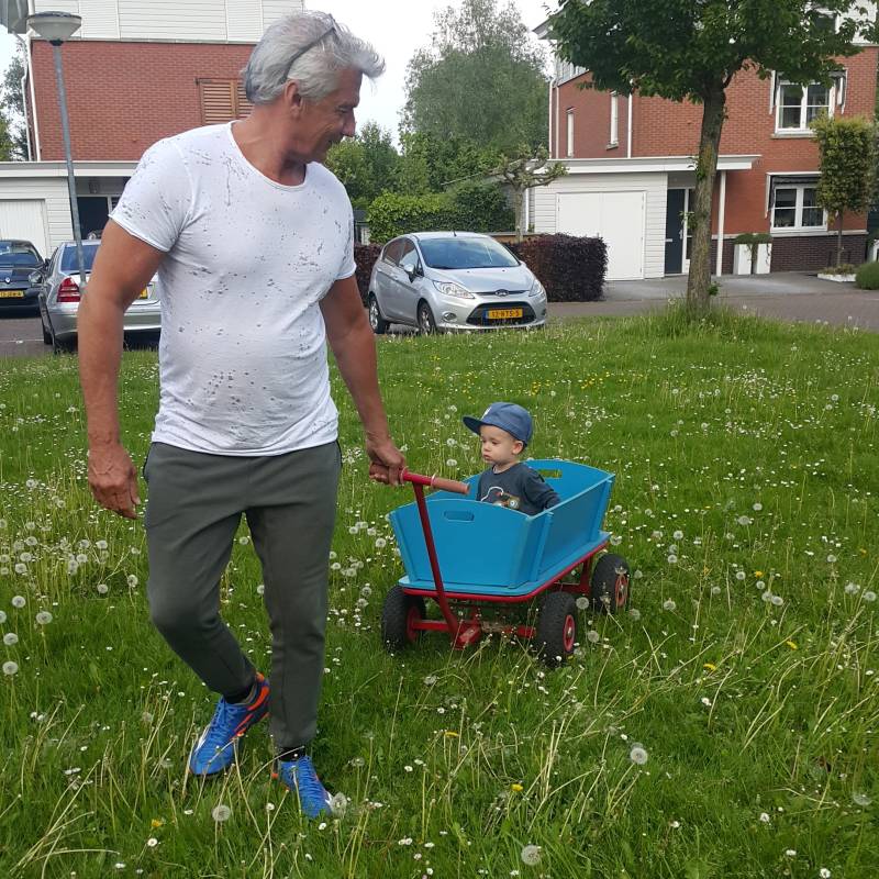Rijden we weer langs de koeien? Hee, daar heb je die tractor met die grote wielen weer, woooooow! Zie je dat, oma? Woooow! Jee, daar heb je opa! Die doet altijd van die gekke dingen, zoals het geluid van een olifant. Nou ja, dat moet het voorstellen. In het begin schrok ik me rot , maar nu weet ik dat het opa is, die ken ik nu wel. Ik mag altijd alles van hem, he. Ik mag nu zelfs achter het stuur zitten in zijn bus! WOW!! En hij kan trucjes met de garagedeur. Die laat hij vanzelf open en dichtgaan. En we gooien samen met stenen op het terras! Lachen, joh. Steeds harder. En we gaan rijden met de bolderkar. Steeds harder en ook over bobbels en door het gras. En ik mag soms iets lekkers proeven, maar nu niet, want daar is mijn mama alweer om me op te halen.