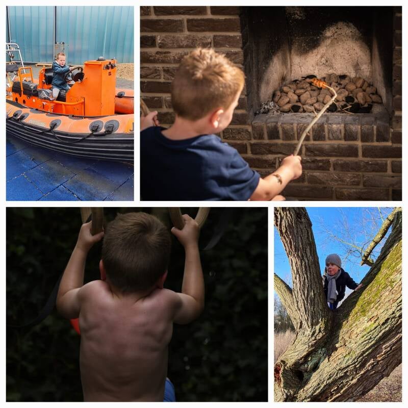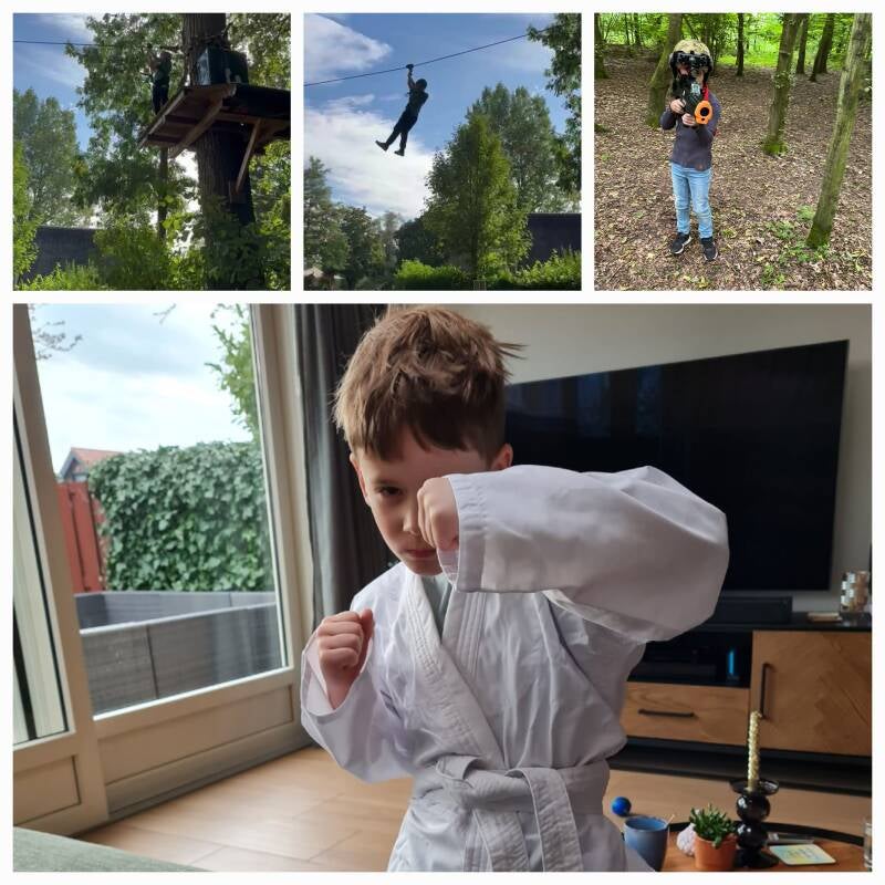 De meest recenste stoere actie wil ik er even uitlichten. En dat betreft een actie op grote hoogte. Dit keer zo hoog als hoge bomen kunnen zijn, want de onderste takken waren al jaren geleden beneden zijn kunnen. Nee, dit keer waren het de hoge bomen van het Klimbos. Zijn vriendje Jonathan was zeven geworden en gaf een feestje, ja, in het Klimbos. Ik was er persoonlijk niet bij, maar kreeg de foto's en de filmpjes doorgestuurd en ik kan zeggen dat ik onder de indruk was. Hoog tussen het gebladerte klom Max middels een touw van de ene boom naar de andere.