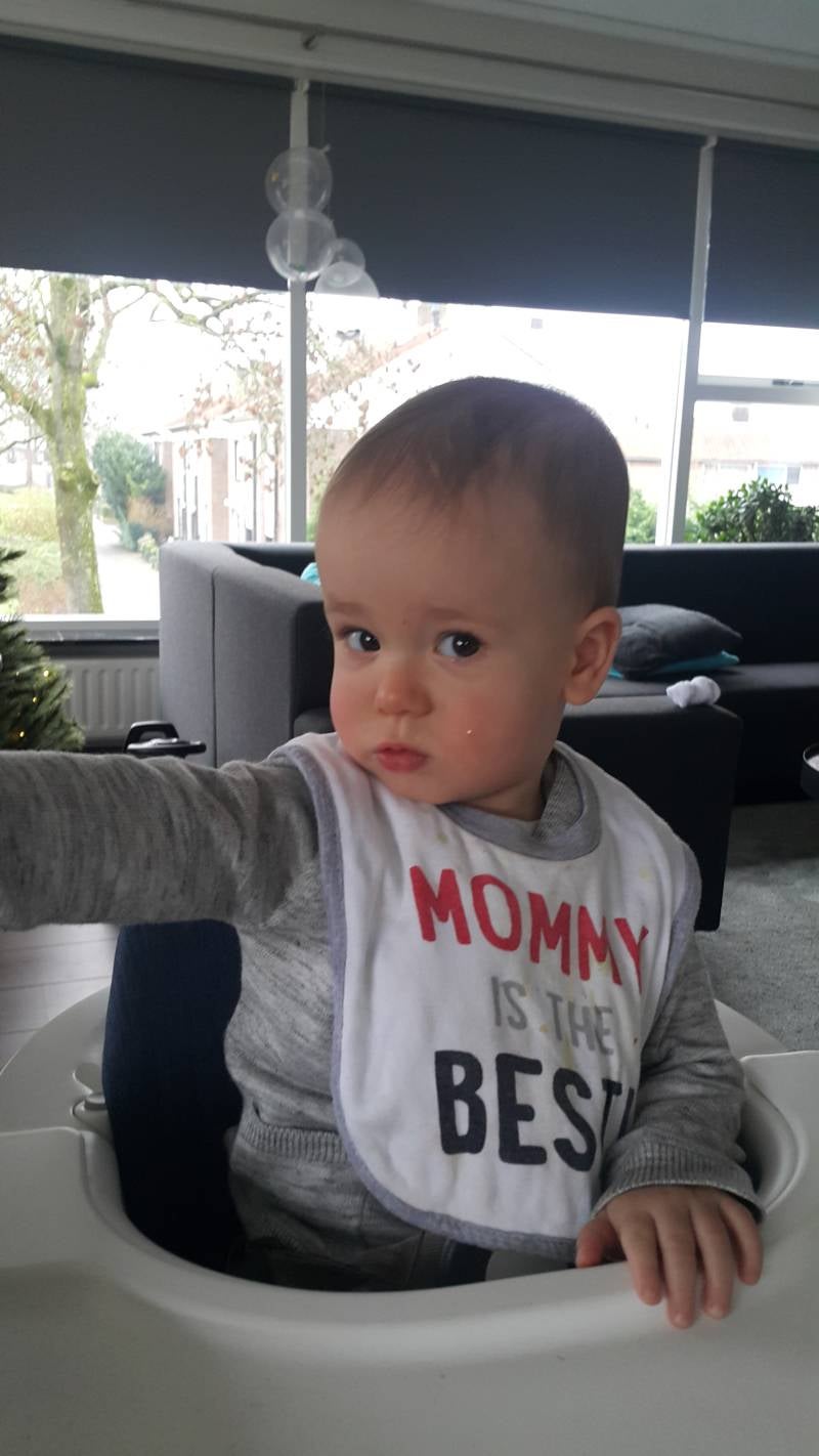Max's eerste echte woord wat hij vaak gebruikt en waarvan hij de betekenis kent is "bah!" Als zijn luier verschoont moet worden en hij is gewoon kletsnat zal je hem niet horen, maar als hij de luier in kwestie, opgerold en vastgeplakt, klaar voor de luieremmer in het vizier krijgt is het"BAH!" Zo is dat Max! Opgeruimd staat netjes
