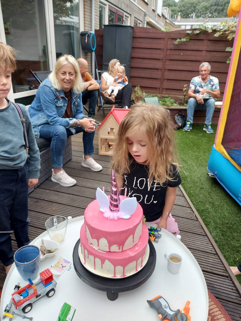 Tess is nu drie jaar en dat hebben we uitbundig gevierd. Op haar derde verjaardag scheen de zon ook uitbundig en kon haar feest in de tuin gevierd worden. De trampoline werd tijdelijk naar de achterkant van de tuin verplaastst om het springkussen, wat voor die dag gehuurd was, een prominente plek in het midden van de tuin te geven. Tess is dol op unicorns en een groot fan van Elsa uit de film Frozen. En dus was er een unicorntaart en een unicornspringkussen en een Elsafiets en een Elsajurk met een bijbehorende blonde Elsavlecht.