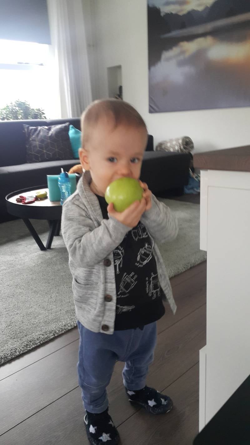 Met lopen heb je je handen vrij, iets wat je met kruipen niet hebt, natuurlijk. In het geval van zijn konijnenknuffel maakte dat niet uit, die sleepte hij gewoon mee in zijn mond met zijn gekruip door het huis. Maar er zijn voorwerpen die je nu gewoon wel kunt meekapen in je beide knuistjes, zoals bijvoorbeeld die felbegeerde groene appel van oma. Zo'n echte oma-appel, alleen de achternaam klopt niet bij deze Granny, maar dat zal Max een zorg zijn.