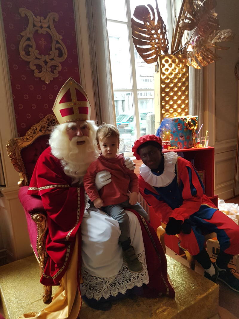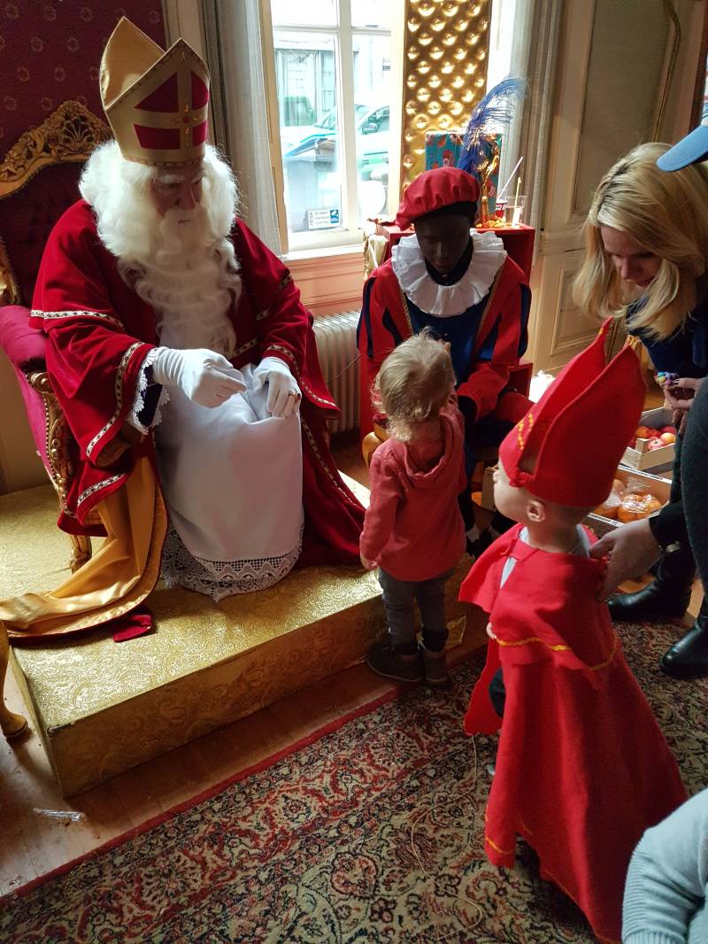 We betreden de tijdelijke woning van de Sint, mama met Tess onder haar jas in een draagdoek, Max en ik. En Max' mond valt dicht. Binnen wordt hem een mandarijn aangeboden en weer is het "thuis", dus nee, bedankt. In de Bakkerij mocht je een koekje versieren, maar dat liet je aan oma over, want je wilde "Klaas" zien. Was hij wel thuis?