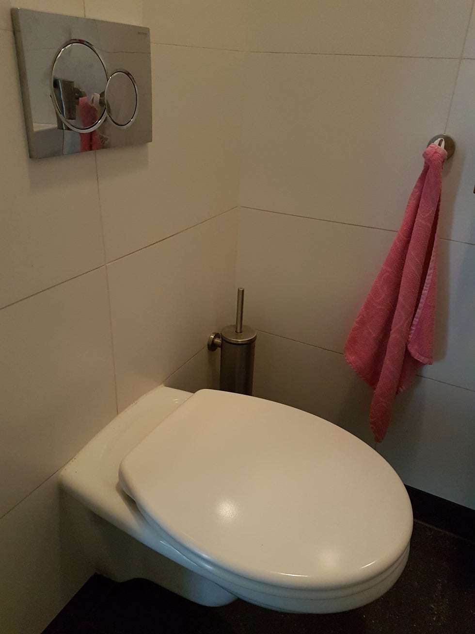 Een laatste restje water stroomt het gat in waarin alles verdwijnt, maar Max heeft het weleens beter gezien. Maar dan, in een laatste poging om de waterval in de wc te aanschouwen krijgt hij een ingeving, of het kan ook toeval zijn. Hij doet het deksel dicht, klimt op het deksel en drukt met twee handen de grootste van de twee drukplaten in. Het water klinkt als een heuse waterval en Max laat zich vliegensvlug van het deksel glijden, tilt het deksel op en... ja!! Daar gaat me toch een plons water over het witte porselein van de pot het gat van de afvoer in, richting riool. Schoon water, zo zonde, maar zo fantastisch om te zien. Dit schouwspel mag hij van mij nog twee keer meemaken, dan is het klaar en dat vindt Max ook, want dan is zijn aandacht getrokken door de wc- borstel, " Afblijven, bah, Max!" en vervolgens het kraantje, wat hij niet open krijgt ( prima, voorlopig) en de luchtverfrisser. Maar dan is het tijd om het kleinste kamertje te sluiten.