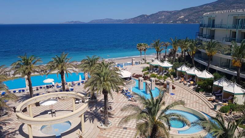 Eenmaal daar had ik al genoeg aan het hotel, het zwembad en de zee. Al zou de hele wedstrijd plots geannuleerd worden, dan zou ik nog een fantastische tijd hebben. Maar nee, alles ging door, tot en met de twee en een half uur durende registratie toe. Mijn rug had er al helemaal geen zin meer in, maar wat moet dat moet. Boodschappen doen moest ook. Na 2x 4km lopen zonder een winkel te vinden had rug het even helemaal gehad met mij. Even liggen gaf wat verlichting, maar na nog eenzelfde route van 2x 4km waarop de winkel wel gevonden werd was het oorlog met rug. Stappenteller was tevreden, maar met een wedstrijd voor de boeg, moest ik de witte vlag laten wapperen. Twee gekwelde voeten ( vanwege vele kilometers op slippertjes)capituleerden met rug mee. Hier was sprake van een overgave. En dat werd gevierd met kip souvlaki! En wijn. Yamas!